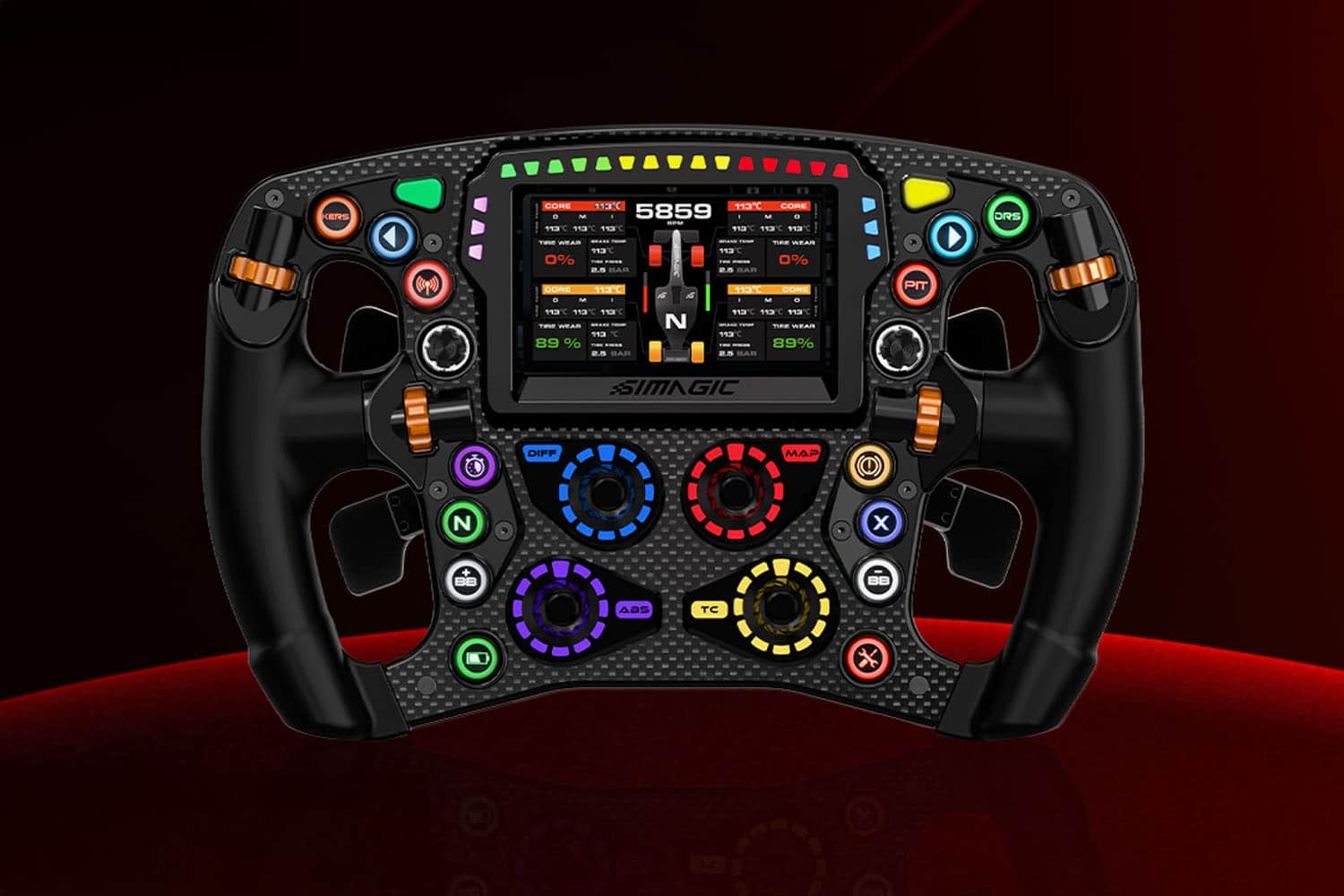 Jeśli chodzi o drugą zapowiedź, jest to nowa kierownica w stylu Formula, która uzupełni gamę kierownic Simagic. Nazywa się Zeus Formula i wydaje mi się, że jest ewolucją FX Pro. Zeus Formula ma prostokątny design, typowy dla Formula, z uchwytami, które tym razem są zamknięte na dole. Pośrodku nadal mamy ekran otoczony elementami sterującymi. Kierownica ma średnicę 28 cm i jest wykonana z aluminium obrabianego CNC. Płyta czołowa wykonana jest z włókna węglowego, a z tyłu znajdują się magnetyczne łopatki.